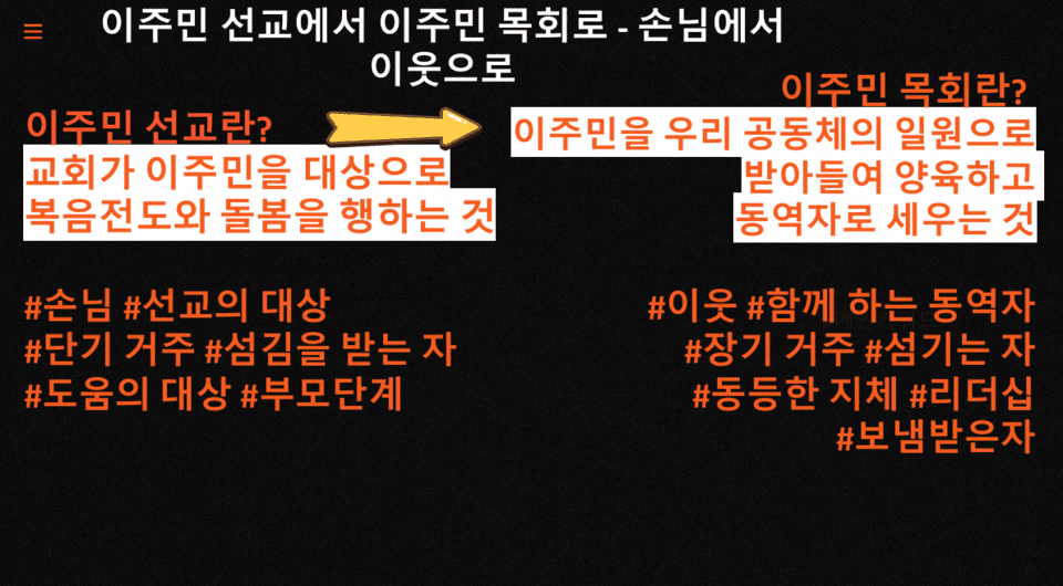 손 선교사는 "E-9, H-2, D-2, F-4, F-5 등 다양한 비자 유형으로 장기 체류하는 이들은 더 이상 일시 방문자가 아니라 우리와 함께 살아갈 이웃이 됐다"고 설명하면서 "이주민들을 하나님의 섭리 가운데 이 땅으로 보내신 목적은 명확하다"며 "제사장 나라로서 한국교회가 열방을 섬기라는 하나님의 명령"이라고 해석했다.