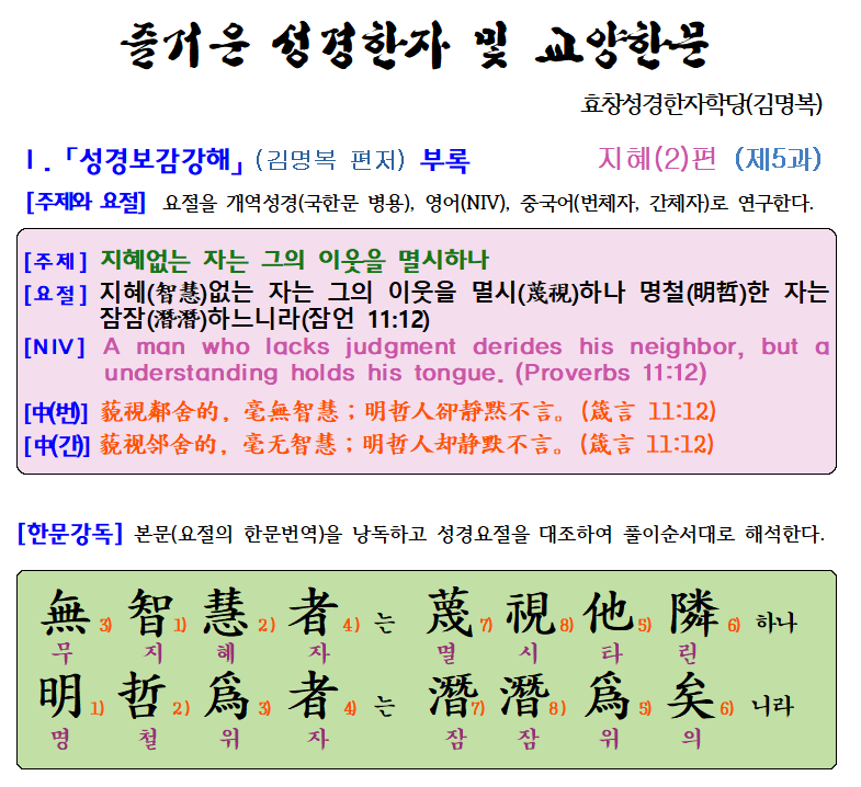 [요절] 잠언 11:12 “지혜 없는 자는 그의 이웃을 멸시(蔑視)하나 명철(明哲)한 자는 잠잠(潛潛)하느니라 ”