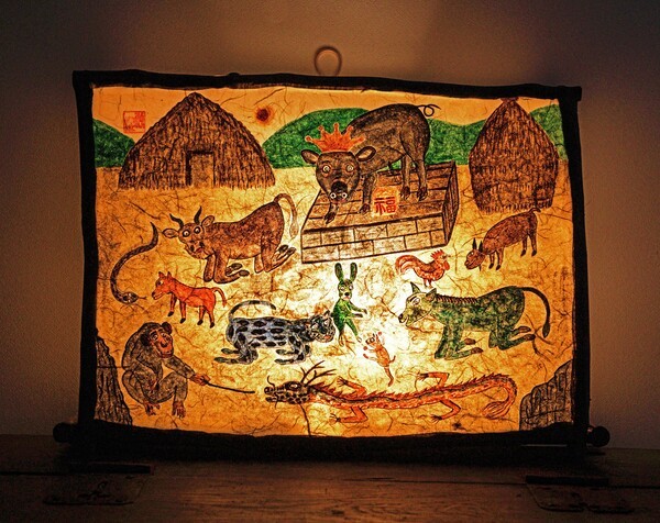 백두산 토굴에서 평생 사시다가 작고하신 백두산 융익 선생께서 직접 나무를 자르고 찌고 굽고 덖어서 만든 작품에 남우주비의 아이디어를 한지 그림으로 작품화 하였다.