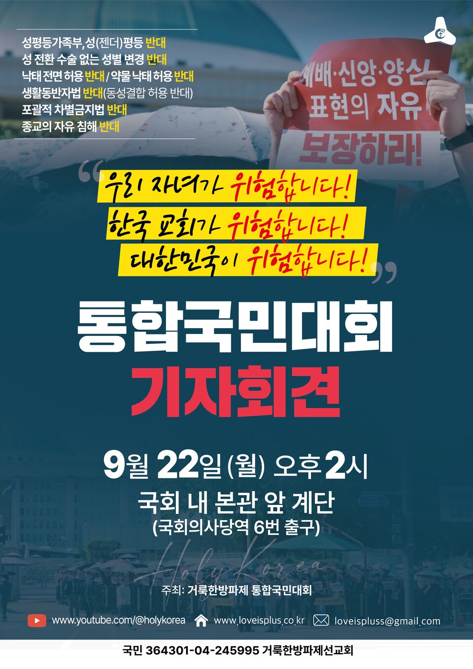 거룩한 방파제는 지난 22일(월) 국회 내 본관 앞 계단에서 기자회견을 열고 오는 9월 27일 통합국민대회를 연다고 밝혔다.