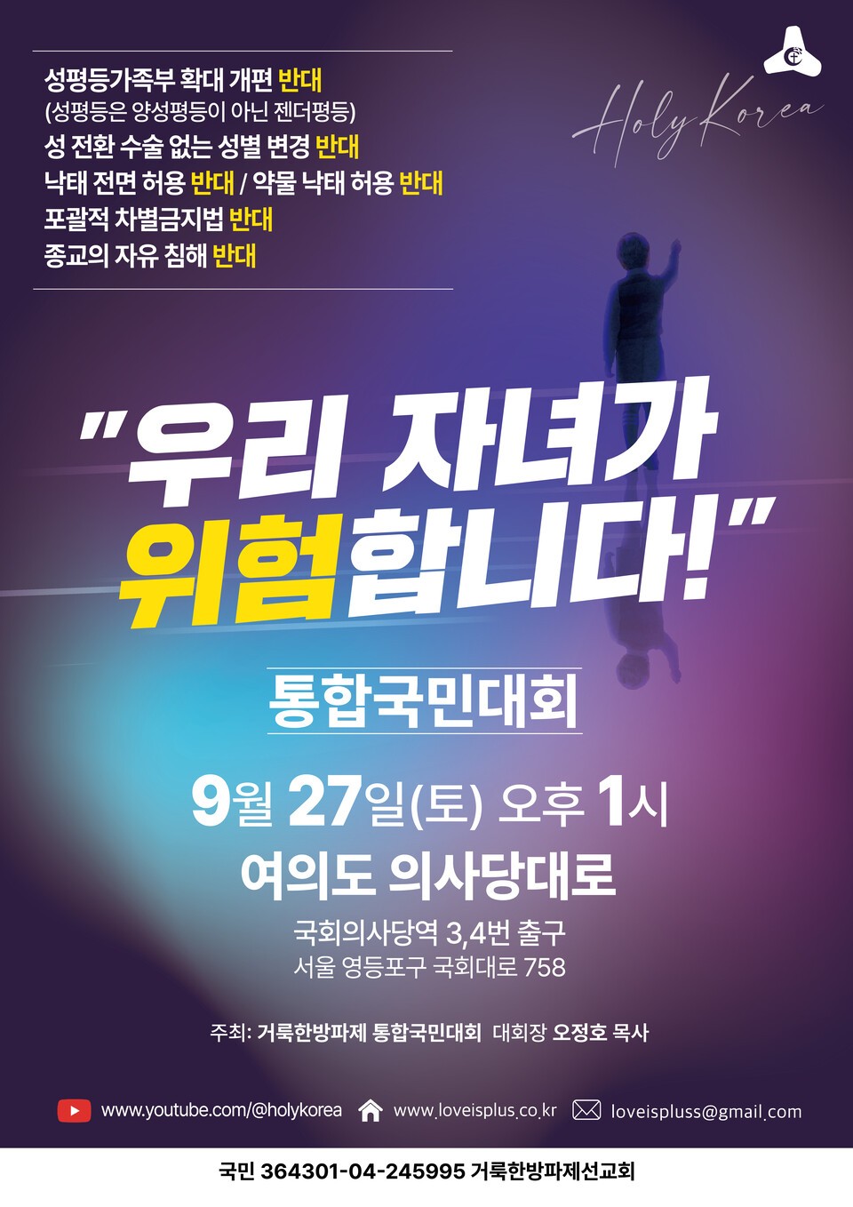이에 우리의 미래세대를 보호하고 건강한 대한민국을 만들기 위해 9월 22일(월) 오후 2시 국회 본관 앞에서 기자회견을 대대적으로 갖고, 9월 27일(토) 오후 1시 여의도 의사당대로에 수많은 국민들이 통합국민대회로 모여서 우리의 의견을 만방에 표방할 것이다.