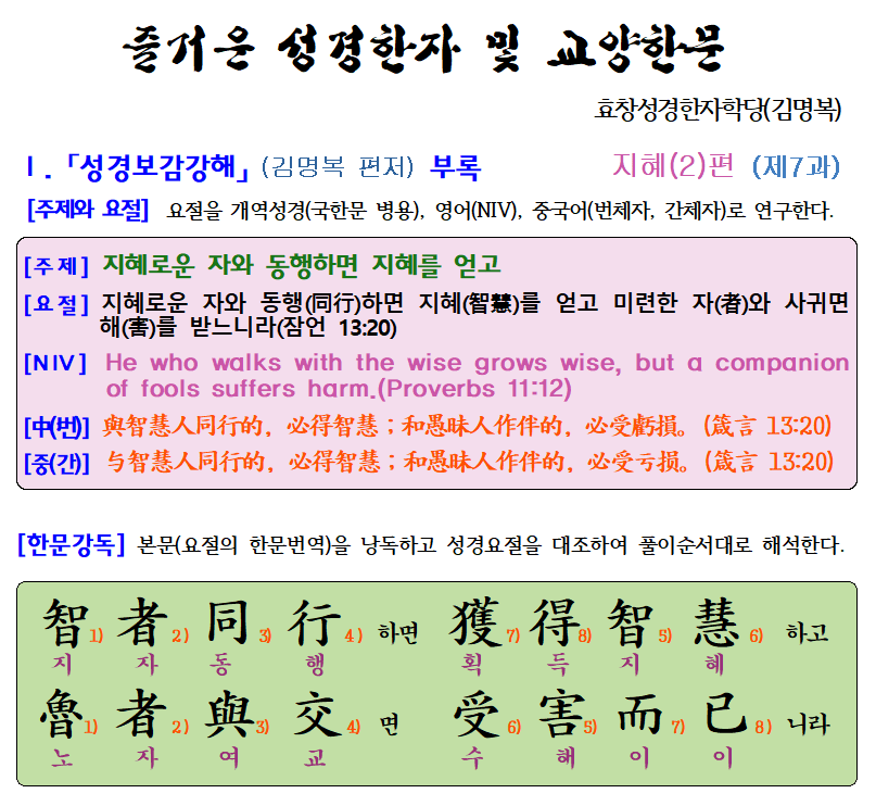 [요절] 잠언 13:20 “지혜(智慧)로운 자와 동행(同行)하면 지혜(智慧)를 얻고 미련한 자와 사귀면 해(害)를 받느니라”