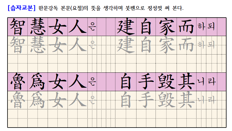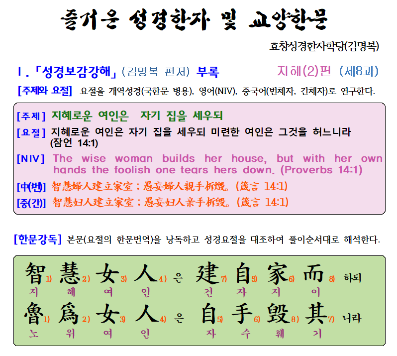 [요절] 잠언 14:1 “지혜(智慧)로운 여인(女人)은 자기 집을 세우되 미련한 여인은 자기 손으로 그것을 허느니라”