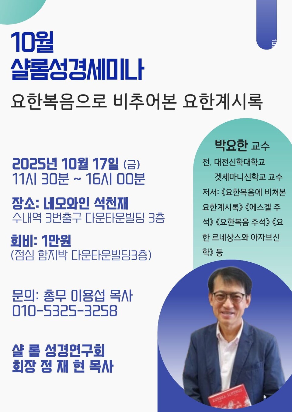 아울러 박요한 교수의 10월 샬롬성경세미나도 진행될 예정이다. 샬롬 성경연구회(회장 정재현 목사)의 주관으로 “요한복음으로 비추어 본 요한계시록”이라는 주제로 열리는 이번 세미나는 오는 10월 17일(금) 오전 11시 30분부터 오후 4시까지 열릴 예정이며 장소는 네오와인 석천재(수내역 3번 출구 다운타운빌딩 3층)이다. 회비는 1만원이며 식사를 지원할 계획이다. (문의: 이용섭 목사 010-5325-3258)