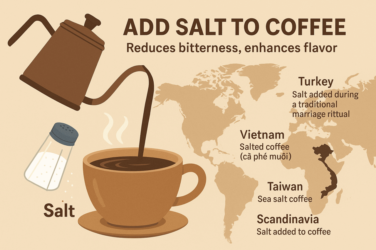 ●북유럽 및 해안 지역: 스칸디나비아 반도를 비롯한 북유럽 일부 지역과 바닷가 인근 국가들에서는 예로부터 커피에 소금을 넣는 습관이 전해 내려온다. 특히 지하수에 미네랄과 불순물이 많아 커피 맛이 씁쓸해질 때, 약간의 소금이 그런 쓴맛을 중화시켜주는 전통 요령으로 쓰였다. 실제로 노르웨이와 스웨덴 등에서는 커피를 끓일 때 약간 짭조름한 염수(바닷물이나 소금을 탄 물)를 사용하는 방식도 있었고, 해군 선원들 사이에서도 배 위에서 커피를 끓일 때 소금을 넣는 것이 오랜 관례였다는 이야기가 전해진다.