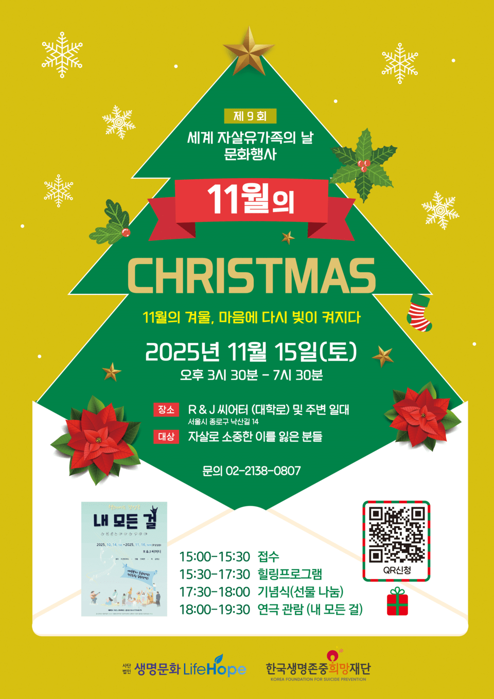 Lifehope기독교자살예방센터(대표 조성돈)와 한국생명존중희망재단(이사장 황태연) 오는 11월 15일(토) 오후 3시부터 7시 30분까지, 대학로 일대에서 세계 자살유가족의 날 기념행사 「11월의 크리스마스」를 공동으로 개최한다. 이번 행사는 사랑하는 이를 잃은 유가족들이 기억과 추모를 통해 마음의 불빛을 다시 켜고, 서로의 회복과 연대를 경험하는 생명존중 문화행사로 마련되었다.