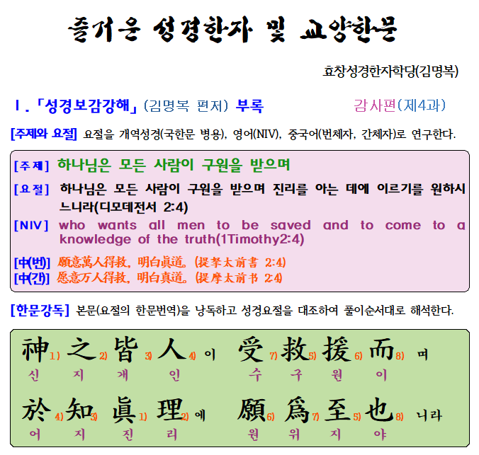 [요절] 디모데전서 2:4 “하나님은 모든 사람이 구원을 받으며 진리를 아는 데에 이르기를 원하시느니라”