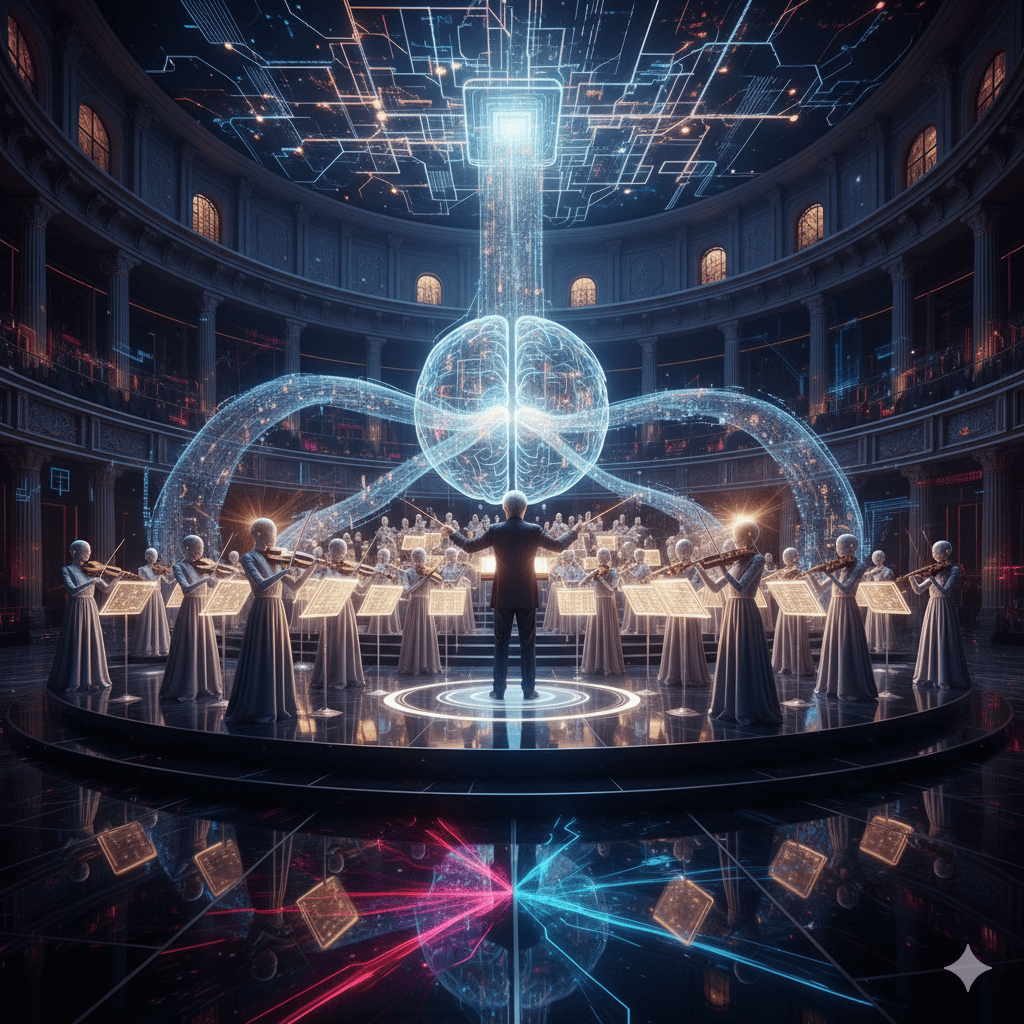 ▶심층 해설: '오케스트레이션'은 '편곡'보다 상위의 '설계' 개념이다. 이는 이미 IT 업계에서 'AI Orchestration'이라는 용어로 쓰이고 있다. 리더는 단순히 '생성형 AI'라는 하나의 '악기'(예: 현악기)에만 투자하는 것이 아니라, 기존의 '분석 AI'(목관악기), '자동화 로봇(RPA)'(타악기), '클라우드 인프라'(베이스) 등 조직의 모든 이질적인 기술 '음색'들을 '총보(full score)' 위에서 조화롭게 배치하고 결합하여 최대의 비즈니스 임팩트(Tutti의 포르테)를 내도록 안배해야 한다.