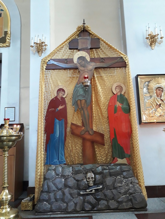 그들만의 특별한 이콘이 눈에 들어왔다. 포크롭스키 정교회 안에 있는 십자가에 달리신 예수님의 모습이다. 유럽의 성당들을 순례할 때 느껴지는 화려하고 웅장한 조각상이 아니라, 마치 도화지에 그린 목탄화를 오려 붙인 듯한 느낌이다. 솔직히 필자에게는 정교하고 입체적인 서양의 십자가상 보다 더욱 마음에 끌렸다.