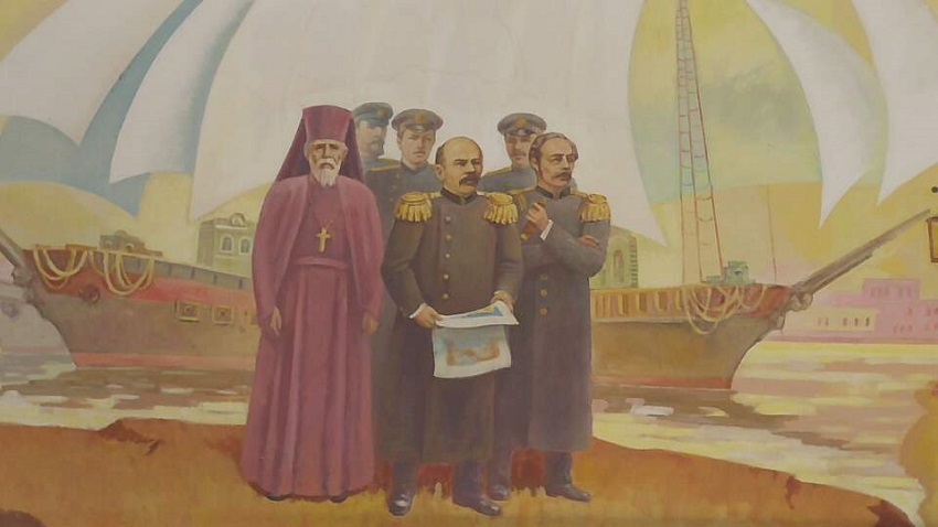 | 블라디보스톡 대합실 천장의 역사화에도 어김없이 정교회 사제가 등장한다(김계현 목사 제공) |