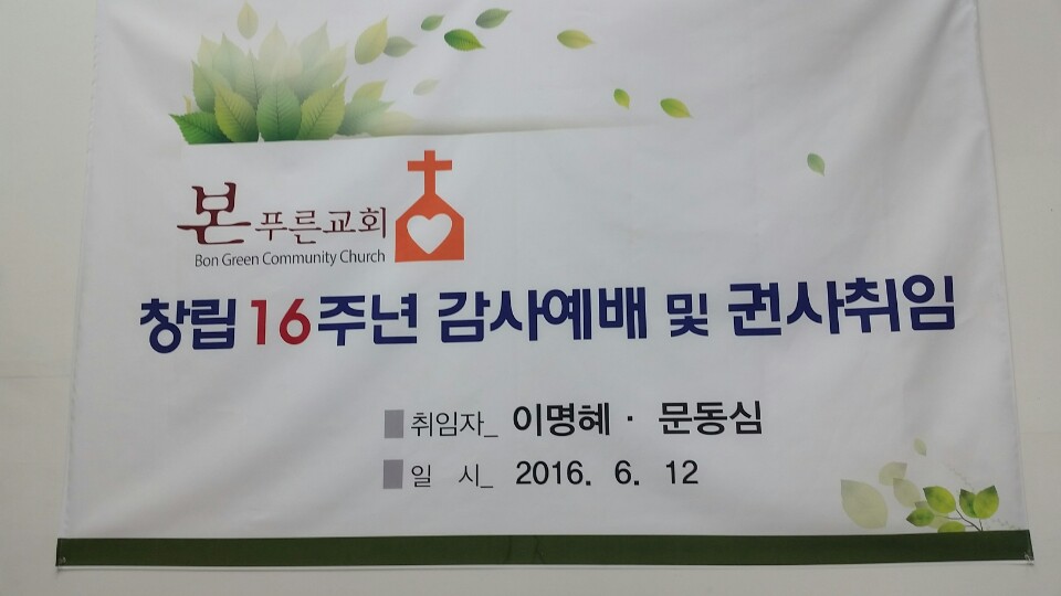 2000년 6월 11일에 창립한 본푸른교회는 최서형 장로의 대표기도, 시온찬양대의 "우리를 사용하소서" 특별찬양에 이어 지금까지 16년 동안 교회를 이끌어온 최원영 목사의 설교가 이어졌다. 성경본문은 민수기 18:20을 바탕으로 "하나님이 나의 유산임을 알라"는 주제로 다시한번 예수가 나의 기업이요, 하나님이 나의 기업인 것을 확인하고 강조하였다.