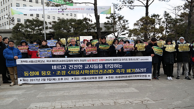 또한 차학연은 2월 9일에는 서울 종로구 서울시교육청 앞에서 기자회견을 열었다. 이 날 차학연은 동성애의 문제점을 알린 중학교 교사에 대해 서울시 학생인권조례를 근거로 조사에 착수한 것은 동성애에 대한 건전한 비판마저도 차단하는 행태라며, 서울시 학생인권조례는 동성애자의 권리만을 일방적으로 옹호하고 건전한 성윤리를 가진 교사들의 교권을 심대하게 역 차별할 뿐만 아니라 그들을 범법자로 만들고 있음을 강력하게 항의했다.
