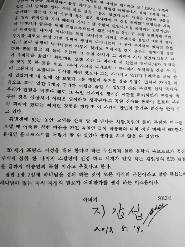 ◐친절한 독일 신사를 만난 사건 독일 신사를 만나 즐거운 구라파 여행을 한 사실을 얘기하고 싶다. 1983년 65세에 구라파 여행을 계획했다. 이유 중 하나는 독일 튀빙겐 대학원에서 철학 공부를 하고 있는 3녀 순희를 만나 격려하고 싶은 마음도 있었다. 나와 아내는 간단한 선물을 준비해야 하는데 자식 사랑에 욕심 많은 집사람이 큰 짐을 준비했다. 여행길은 가벼운 짐이 원칙인데 자식 때문에 가지고 갈 수밖에 없었다. 처음 목적지는 런던이었는데 비행기가 급유를 위해 프랑크푸르트에 40분 머무는 동안 큰 짐을 순희에게 부치러 비행장을 나와서 지나가는 독일 신사에게 가까운 우체국을 물었다. 그분이 일러주기를 대로로 곧장 가면 우편에 광장이 나타나는데 그곳에 우체국이 있다고 말했다. 가보니 광장은 있는데 아무리 찾아도 우체국을 발견하지 못했다. 비행기를 놓칠까봐 짐을 들고 돌아왔는데, 그 독일 신사가 그 자리에 서 있었던 것이다. 내가 우체국을 찾지 못한 것을 보고 그분이 직접 안내해서 우체국을 찾아 짐을 붙일 수 있었다. 고맙다는 인사를 나누고 독일 신사는 사라졌다. 독일 신사 덕분에 40여일간 7개국 구라파를 가벼운 마음으로 여행할 수 있었다. 우리가 친절을 베푼다 해도 그 독일 신사처럼 장시간 시간을 허비하면서 친절을 베푸는 것은 상상하기 어려운 일이라고 생각된다. 그 독일 신사를 통하여 친절한 사람이 되어야겠다는 뼈저린 경험을 했다. 또 이 사건이 만년의 즐거운 회상을 안겨 주고 있다. 튀빙겐에 있는 동안 교외를 산택 할 때 만나는 독일인들이 목례와 미소를 보낼 때, 이러한 착한 마음을 가진 독일인들이 히틀러의 나치 정권 하에 600만의 유태인 홀로코스트를 어떻게 할 수 있었나 생각을 하지 않을 수 없었다. 20세기 프랑스 지성을 대표한다고 하는 무신론적 실존 철학자 싸르트르가 공산주의에 심취한 나머지, 스탈린이 인정하고 세계가 인정하는 김일성의 6.25 남침을 끝까지 이승만의 북침이라고 우겼다고 한다. 잠언 1장 7절에 하나님을 경외하는 것이 모든 지식의 근본이라고 말씀 하셨는데, 하나님이 없는 지식과 지성의 말로가 어떠한가를 생각하는 이즈음이다. 2013년 5원 19일 아버지 지갑섭