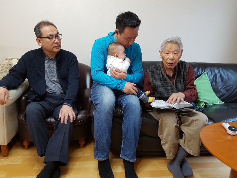 | 사진 좌측부터 아들 지규철 집사(본푸른교회), 손자 지창훈, 증손자, 지갑섭 장로 |