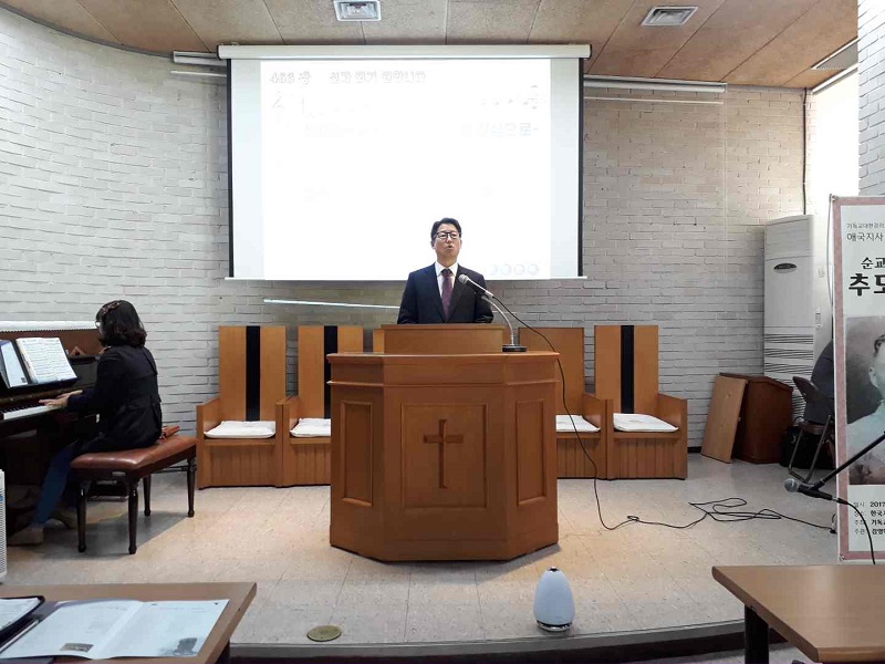 다음으로 이상목 목사(정선교회, 후원이사)의 추모시가 낭송됐다. ‘생명강이 흘러온 그 자리에서’라는 제목의 추모시에서 이상목 목사는 “오늘은 독수리 날개를 빌려 김영학 목사님 당신을 태우고 오르고 싶습니다”라며 시를 낭송했다. 탁현균 목사(성은교회, 기념사업회원)의 성경 봉독을 마치고 특송에 해금연주가 윤혜지(대죽교회)씨의 연주가 이어졌다.