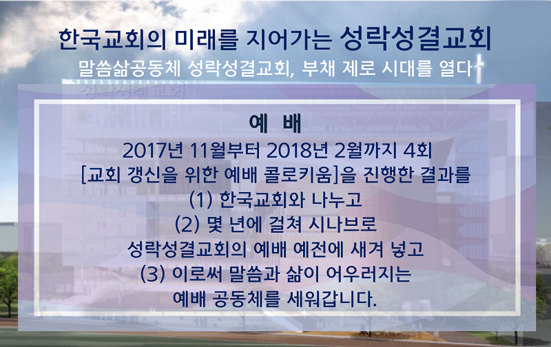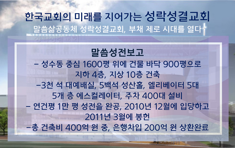 성락성결교회는 지난 2010년 10월 서울 성동구 성수동의 요지에 1,600평 대지 위에 건축면적 900평 지하 4층, 지상 10층의 예배당을 봉헌했다. 당시 성락성결교회는 말씀성전 건축비 총 400억 중에서 200억 원을 대출 받았다. 당시 대출상환 만기는 2019년 9월이지만 해마다 18~20억 원을 상환하여 지난 1월 2일 부채 제로시대를 열었다.