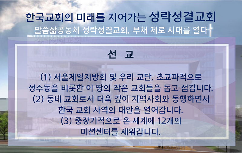 여기에는 교회의 각 부서들이 비용을 절감하고 건물임대 및 주차장 수입 등이 부채탕감에 크게 기여했다. 드디어 부채 제로시대를 여는 성락성결교회는 올해부터 예배와 선교 사역에 더욱 집중한다는 목표를 세웠다.