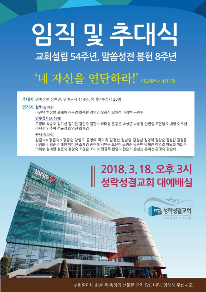 지난 3월 18일 성락성결교회(담임 지형은 목사)가 교회설립 54주년과 성전봉헌 8주년을 기념하는 임직 및 추대식을 거행했다. 아울러 말씀성전 건축 부채 200억 원을 완전히 청산하고 예배와 선교에 더욱 깊이 헌신하기로 했다.