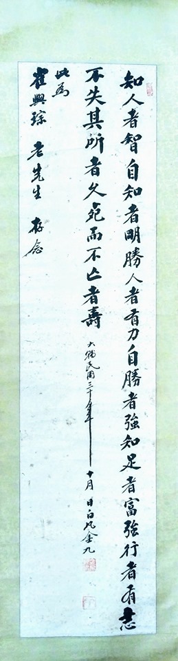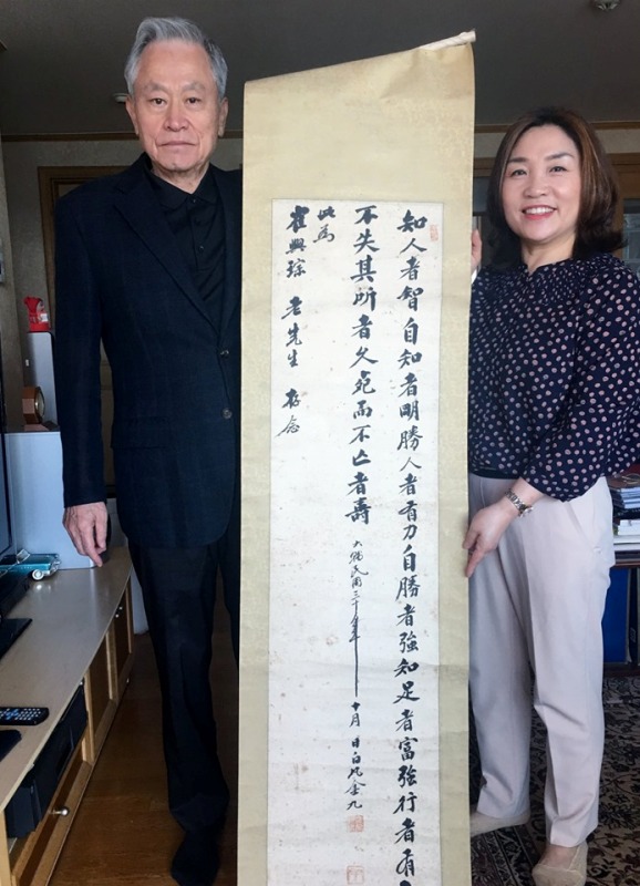 최교수는 "이제 우리집 家寶가 광주시민의 품으로 돌아간 셈"이라고 소회를 밝혔다. 1948년 10월, 백범 김구선생께서 광주를 찿아 증심사 계곡의 <오방정>에서 오방 최흥종 목사를 만나 뵙고 서울로 올라간 후, 다시 장문의 편지와 함께 보내준 휘호이다. 그 휘호의 내용은 노자의 도덕경 33장이다.
