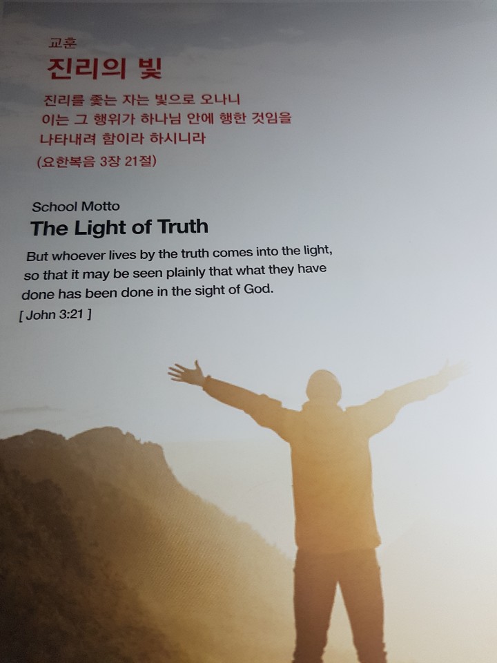 A. 우리 학교의 교훈은 진리의 빛입니다. “진리를 좇는 자는 빛으로 오나니 이는 그 행위가 하나님 안에 행한 것임을 나타내려 함이라 하시니라”(요3:21).