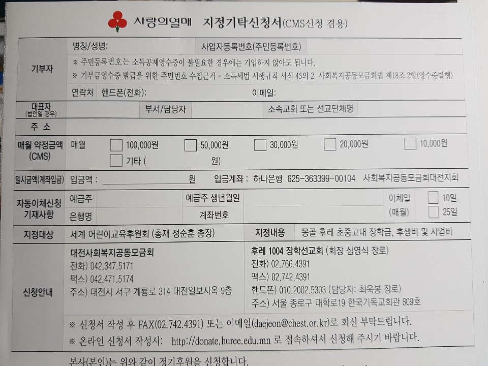 (2)사랑의 열매 지정기탁신청서(후레 1004 장학선교회, 회장 심영식장로)