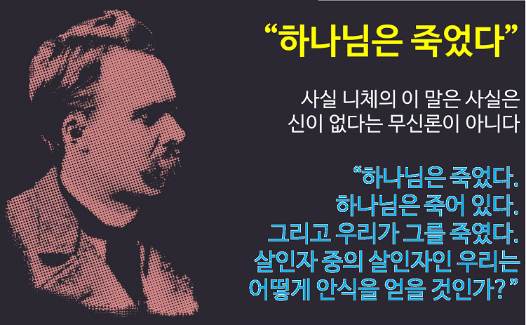 1882년에 저술한 그의 저작 즐거운 지식(Die frohliche Wissenschaft-The Gay Science ) 중에서 , 그것도 사뭇 불길한 아이러니(tragic irony)로 저자와 대비하게 되는 한 광인(The Madman )의 입을 통해 외치게 했던 선언이다. 물론 그는 짜라투스트라(Spoke Zarathustra )를 통해서도 동일한 의미를 함축적으로 표현하고 있지만 어쨌든 광인의 입에서 나온 말 일지라도 어법상 분명한 의도는 하나님이 존재하시지 않는다는 무신론이 아니라 사람들 편에서 하나님이 존재하지 않게 되었다는 탄식, 따라서 우리가 하나님을 죽인 것과 같은 형국이 되었다는 일방적인 비존재의 황망함을 충분히 내포하고 있다. 다시 말하면 하나님이 없다는 신정의(神定義)가 아니라 하나님을 의지했던 기준이 붕괴되므로 우리에게 하나님의 존재가 무의미하게 되었다는 뜻이며 더 나아가 우리가 믿었던 우리식의 하나님은 존재하지 않는다는 의미심장한 표현을 내포하고 있는 것이다.