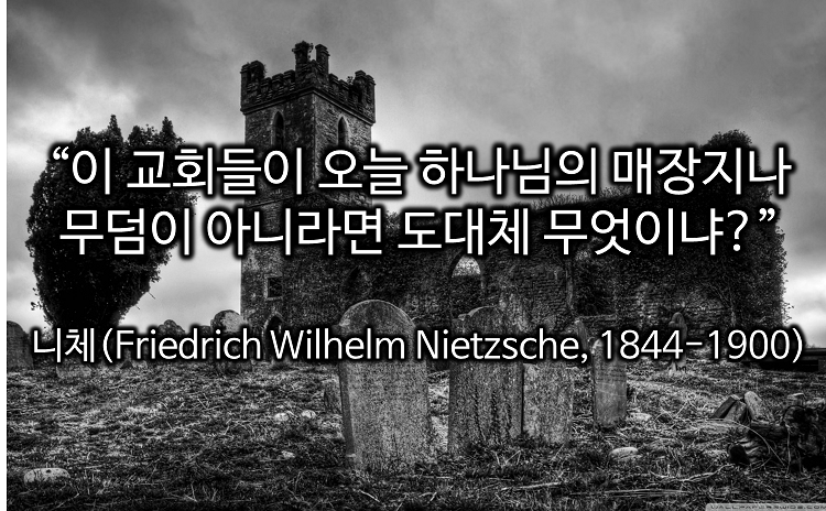니체는 분명히 광인의 입을 통해 하나님의 죽으심을 선언하게 된 근원지를 교회로 포인팅하고 있는 것이다. 철학은 그냥 생성되지 않는다. 시대사고의 반영이다. 종교개혁 후 3백여년어간의 당시교회는 부패한 성직자들로 넘쳐났다. 물질주의 기복신앙으로 성경을 왜곡했으며 정치를 등에 업고 권력을 행사했다. 당시 많은 지성인들은 부패한 교회를 향해 하나님은 죽었다는 표현을 이미 쓰고 있던 터였다. 따라서 광인이 연주한 레퀴엠은 그들이 예배하는 하나님, 금송아지처럼 우상화되고 변질된 하나님의 죽음을 상징하는 비극적인 음악이었던 것이다.