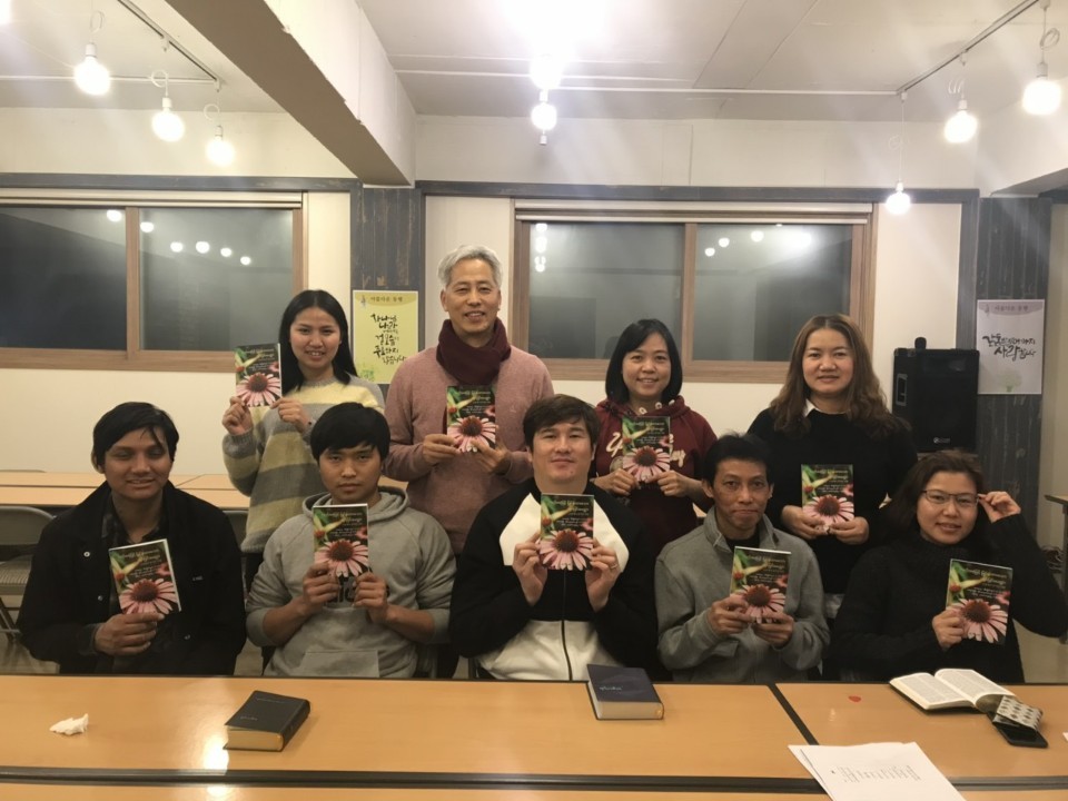 | '책'을 들고 함께 사진을 찍은 미얀마 성도들과 이명재목사 |