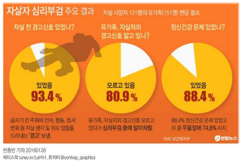 아래 그림에 의하면 자살자 심리부검의 주요 결과를 볼 수 있습니다. 자살자들은 93.4%가 이미 자살 전 경고 신호를 보냈다고 합니다. 반대로 유가족 80.9%는 경고신호를 알지 못했습니다. 자살자의 대부분은 정신건강 문제가 있었다고 보고합니다(8.4%).