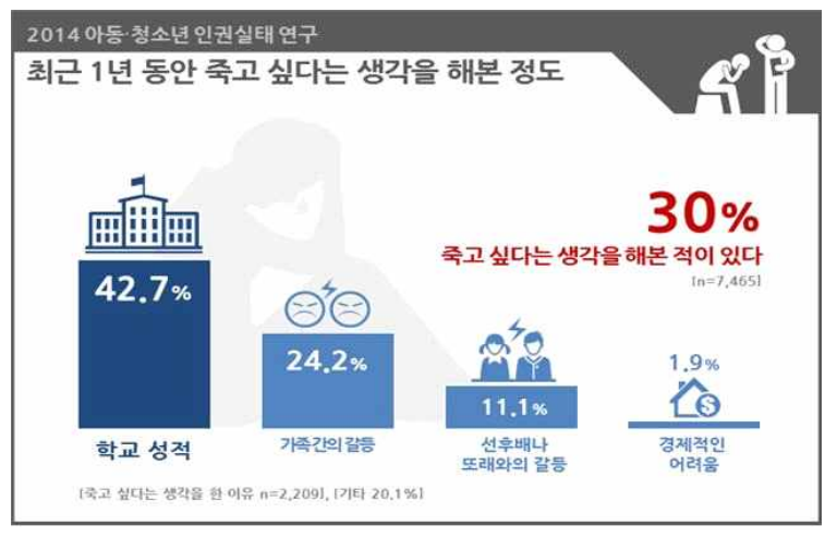 청소년의 경우, 2014년 조사에 의하면, 자살의 대표적 위험요인은 학교성적(42.7%)이며, 가족 간의 갈등도 24.2%가 되었습니다. 선후배 친구들과의 갈등도 1.1%로 나왔고, 경제적 어려움에 따른 비관으로 자살시도는 1.9%였습니다. 학교성적에 대한 염려나 가족 간의 갈등은 모두 청소년기 우울증상으로 나타나며 우울은 자살충동의 가장 강력한 예측변인이 됩니다.