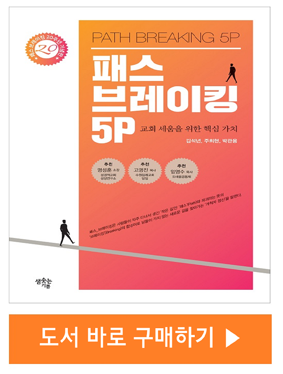 특히 저자 김석년 목사님의 목회 가르침의 아름다운 결실이자 패스브레이킹 워크숍 20주년 결정판인 이 책의 출간을 위해 함께한 제자 주희현 아트교회 담임목사, 박관영 서초교회 부목사가 표지에 함께 표시함으로써 출간의 기쁨을 더했다.