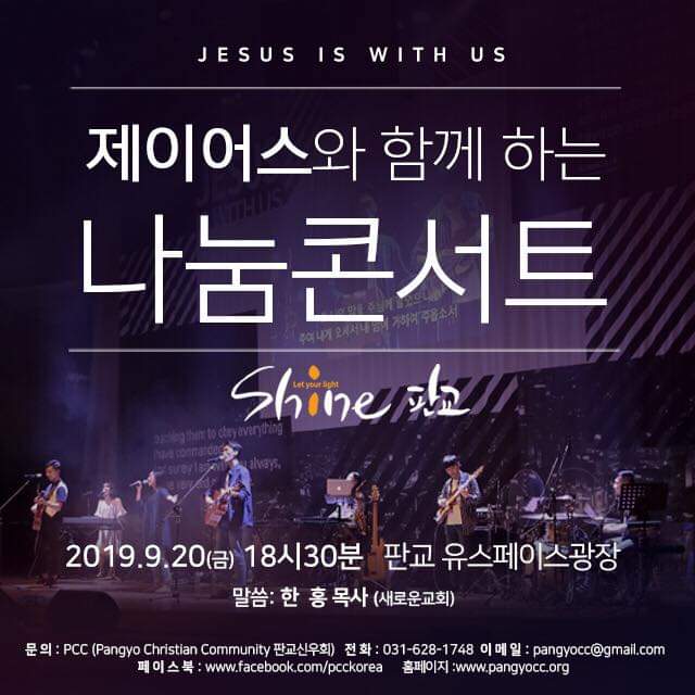 <Shine 판교! 제이어스+한홍 목사님과 함께 하는 나눔콘서트>가 오는 9월20일(금) 오후 6시 판교 유스페이스 광장에서 열린다.