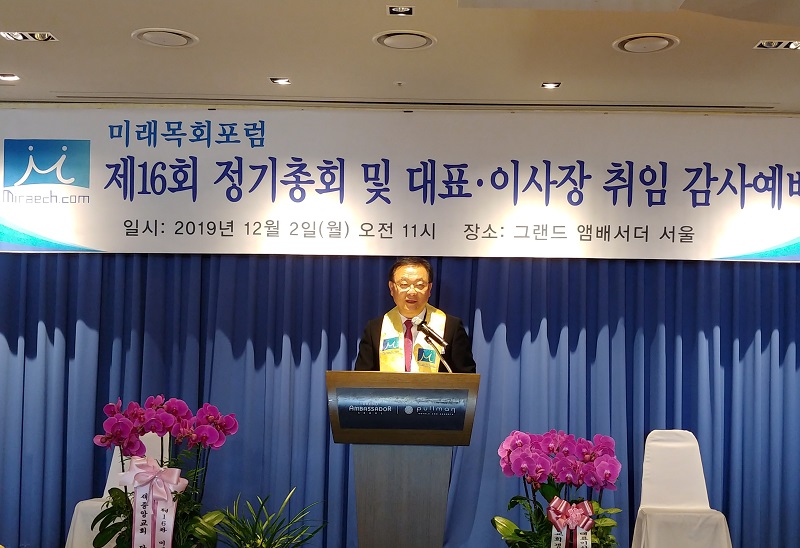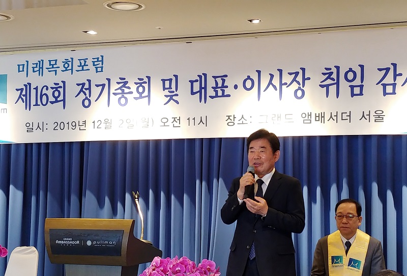 미래목회포럼 제16회 정기총회가 지난 12월 2일(월) 그랜드엠버세더호텔에서 열렸다. 김봉준 대표(아홉길사랑교회 목사)의 사회로 진행된 총회에 앞서 김진표 의원(더불어민주당 의원)의 축사가 있었다. 김진표 의원은 “한국교회가 대한민국 발전에 많은 역할을 했음에도 불구하고 근래에는 좋은 영향력을 상실해가고 있음이 마음 아프다. 미래목회 포럼이 한국교회 새로운 기준을 만들 수 있는 단체라고 생각한다. 또한 한국교회가 국민들을 섬기는 데 힘이 되도록 하겠다”고 밝혔다.