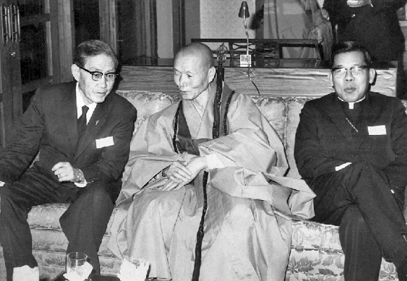 | ▲ 종교간 화합을 위하여 불교(청담) 천주교(김수환 추기경) 대표와 만나 이야기를 나누고 있는 생전의 한경직 목사. 사진제공 한경직목사기념사업회 |