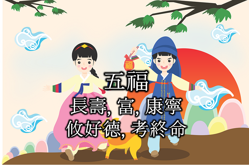 중국의 서경(書經)에서 나오는 오복(五福)은 ‘장수(長壽), 풍족함(富), 건강함(康寧), 후덕(함攸好德), 천명을 다하고 죽음(考終命)’을 말한다. 그런데 민간에서는 귀하게 되는 것과 자손이 많은 것을 오복에 넣기도 한다. 또한 속담에는 사람의 치아가 오복에 든다고도 하는 데 치아가 좋아야 건강하게 오래 산다는 의미라고 본다.