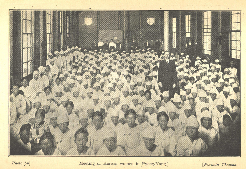 | 1910년 이전으로 보이는 <평양부인사경회>, 마펫 선교사가 서 있다. |