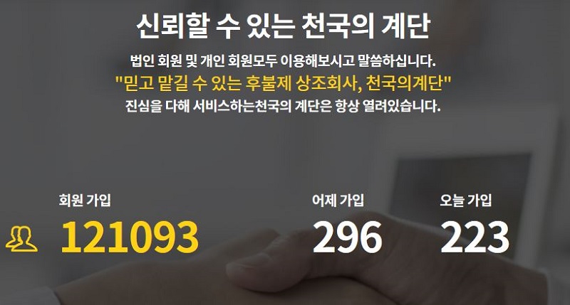 후불제상조기업인 <천국의 계단>은 기존의 선불제상조기업이 갖는 불편하고 위험한 리스크 등을 개선한 상조회사이다. 지금까지 수많은 기업 단체 가입 및 개인 가입 등을통해 12만명의 회원을 확보한 안정적인 기업이다.