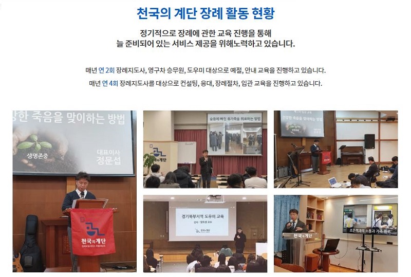 한편 천국의 계단의 무료근조기나눔 사업도 꾸준히 지속되고 있으며 작은교회들에게 실질적인 도움이 되고 있다. 함께 동참하기를 원하는 기업이나 단체 혹은 교회는 문의를 하면 된다.(문의:010-5413-0435)